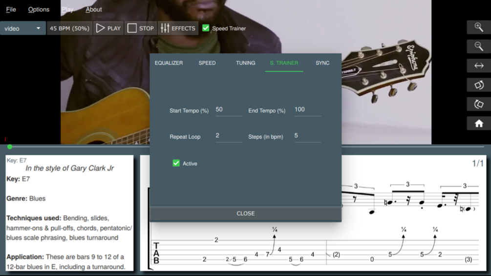 - Advanced tab section with speed, equalizer, tonality controls, loops, and speed trainer