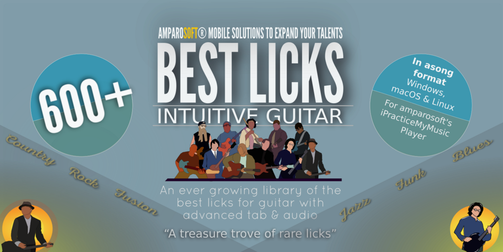 A .asong file is our innovative way of distributing compact musical content for learning without the need of external software. Download our player and start learning these lick series in style, with loops, tempo change, pitch controls and a speed trainer. Usually, one needs different software to learn a lick/song, for instance, a PDF viewer, an audio/video player, and/or a tablature viewer. None of these tools can handle tab/partiture, video and audio in the same software and one needs to switch from one application to the next in order to learn the music. Amparosoft's iPracticeMyMusicPlayer and asong files have everything you need in one place, for better and faster results while making your learning experience more enjoyable.